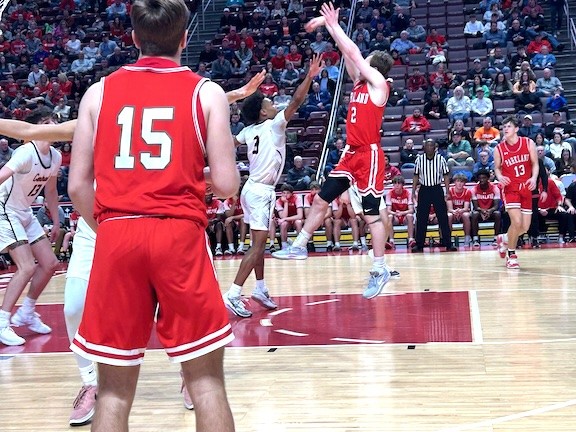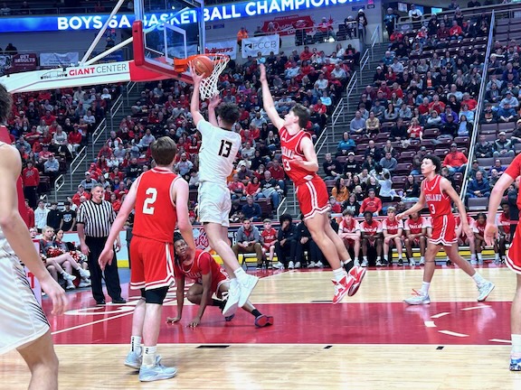 With 1:09 left in the third frame, after trailing since late in the first quarter, Parkland tied the score at 43 on a pair of free throws by 6’ 4” senior Zaire Smaltz. There would be two more ties and two lead changes in the contest, and, with 2:26 left in the game, Central York’s Rill put his side up 50 to 48 on pair of free throws. In the ensuing possession, Parkland missed a shot, and Central York took a time out with 1:55 left in the game. When play resumed, Central York scored on a drive by 6’ 2” junior Ben Natal, and it was 52 to 48, Central York. Parkland shot quickly in their possession, and the shot missed, leading to a free throw by CY’s Natal with 1:13 left in the game. After an exchange of possessions, Nick Coval, a 6’ 2” Parkland senior, scored on a three point play with 49 seconds left, and it was 53 to 51, Central York, with the big crowd roaring. Parkland then blocked a Central York shot. Parkland ran a set play and got an open look, but the shot was inaccurate. With just seconds left in the game, Central York got the rebound, and the rebounder was fouled. CY missed both free throws. Parkland got the rebound, moved the ball up court and launched an open—but inerrant—shot from beyond the arc as time expired. Central York held on for the win for the PIAA Class 6A state title.